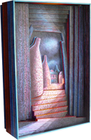 Mixed media on card/wood relief forms, mounted within a coloured/decorated box base.
