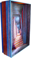 The interior of the working buildings and yard are covered in an effect which emulates a crazed ceramic glaze finish. The treatment is carried through onto the box exterior, as though the artwork is itself made from a ceramic material.